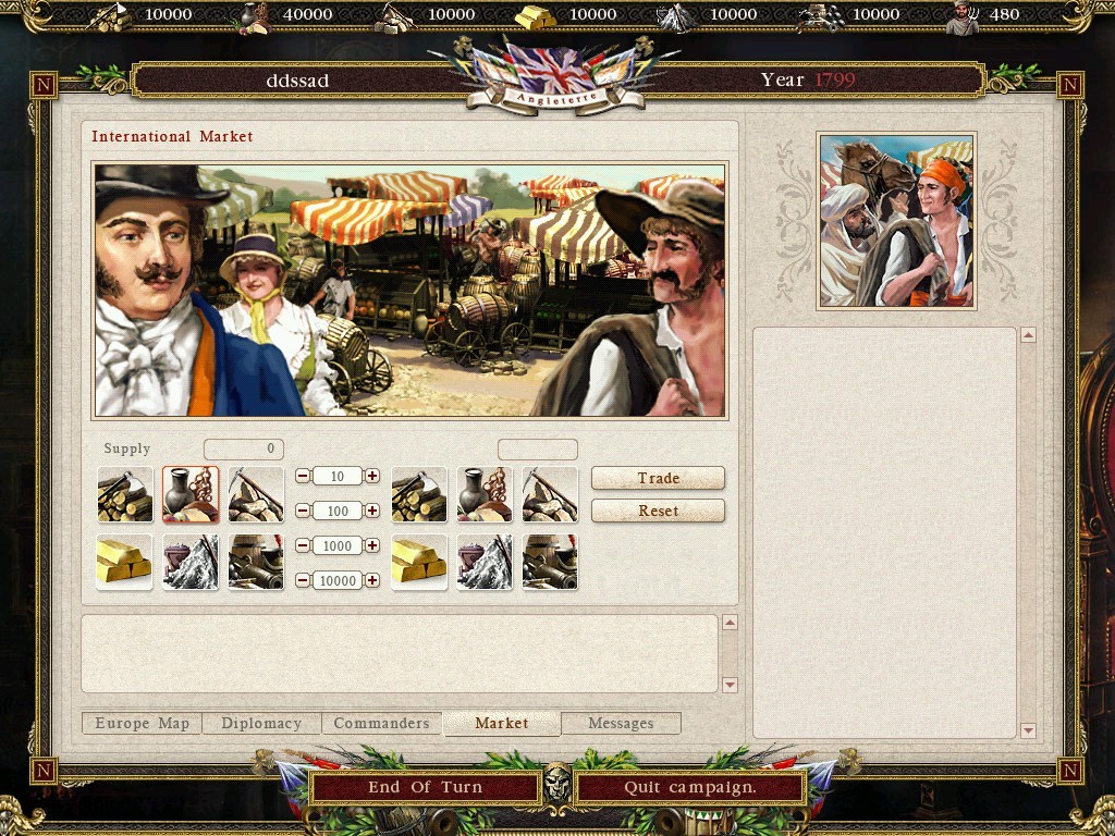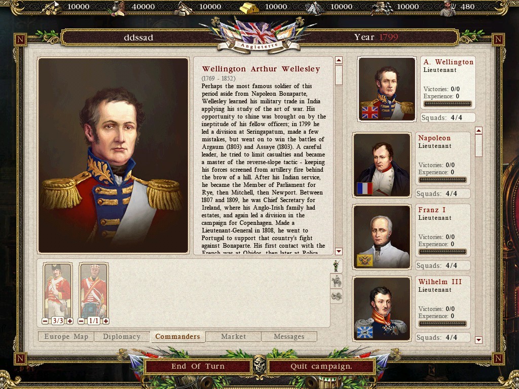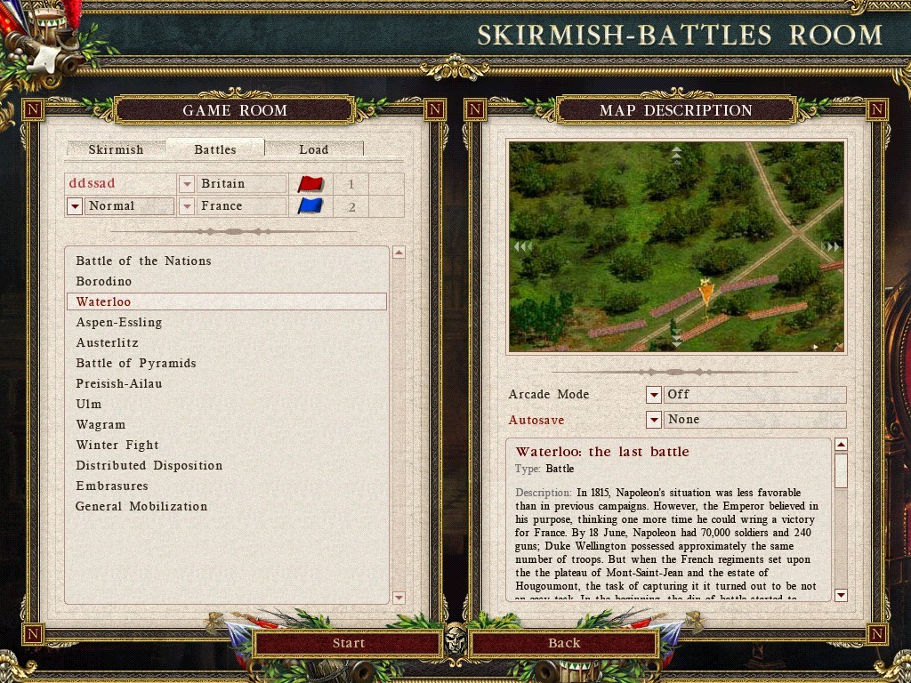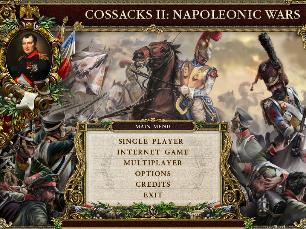 타이틀 화면 입니다 왼쪽 그림에 나폴이 장군이 그려져 있는게 인상적입니다 게임에 나오는 삽화를 보면 러시아군과 프랑스군 뿐인데 그이유가 나폴레옹이 전쟁에서 진이유가 결정적으로 러시아 와 의 전쟁에서 패배했기 때문에 저렇게 표현 한것같습니다