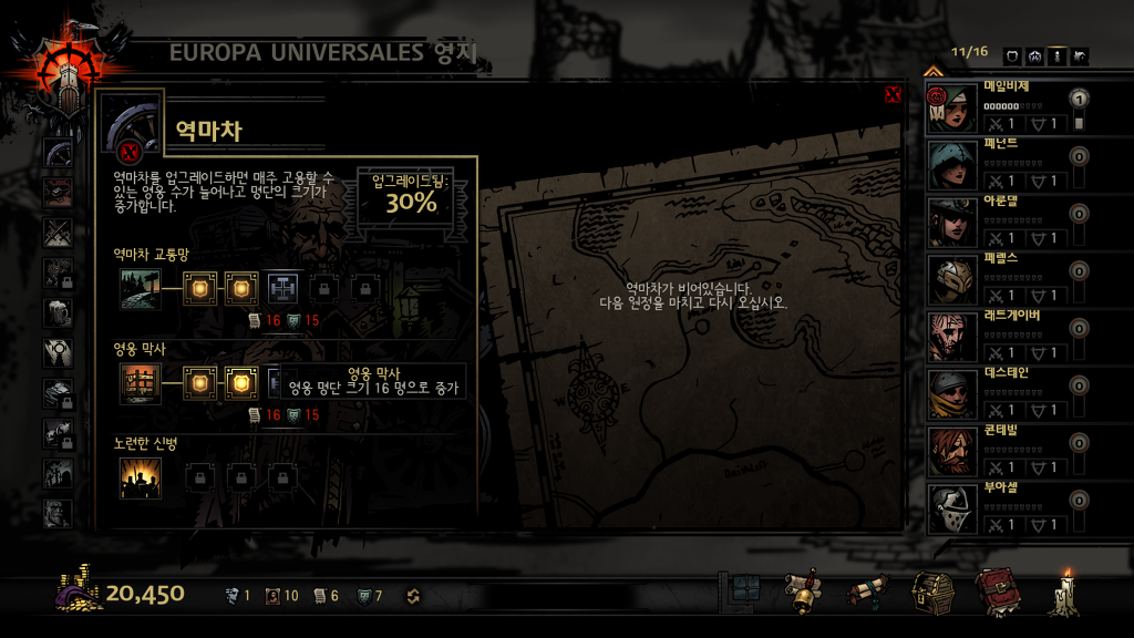 역마차는 업그레이드해서 16명으로 만들고 대충 16~20명으로 가장 어두운 던전 1층에 도전할 생각입니다