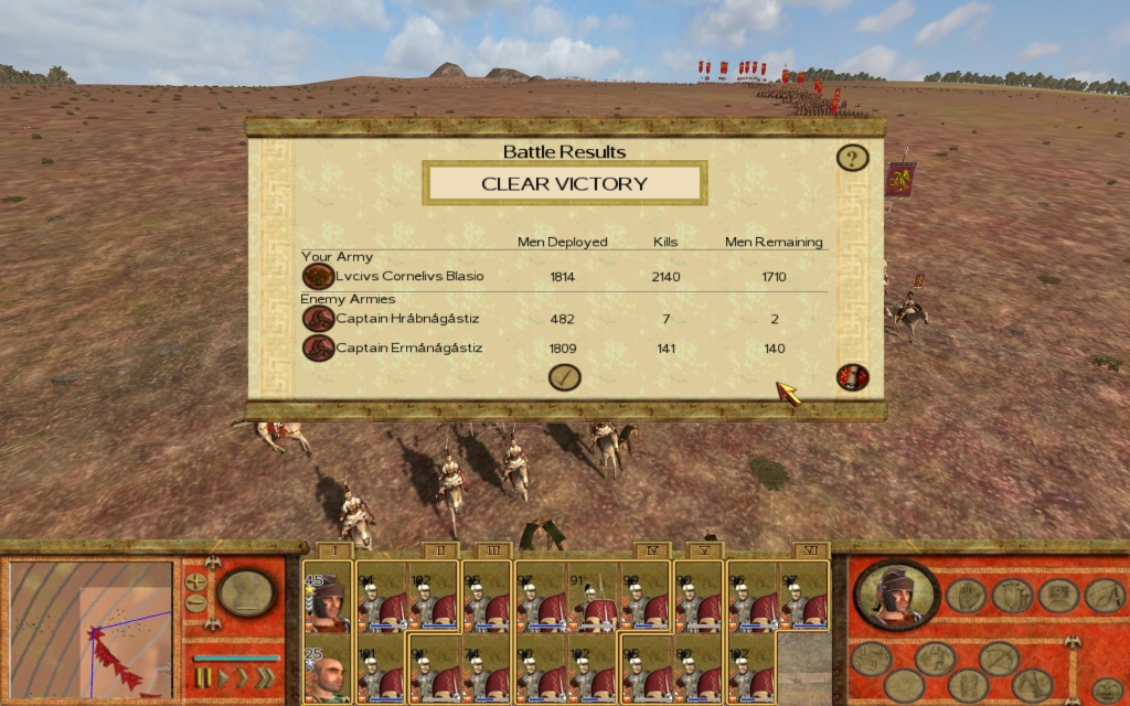삼분의 일정도가 사망해서 간신히 이겼습니다...(다행히 우리편 장군인 '대머리술라'의 아들 '크나에우스'가 백병전에 강하네요...)