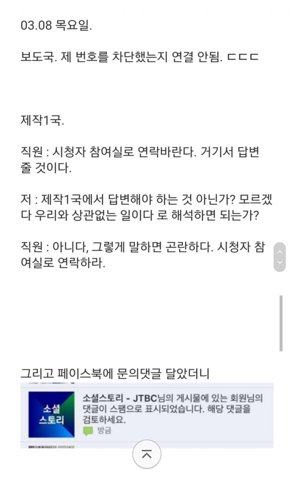 jtbc의 졸렬함 ㅎㄷㄷ 작성자뱌실이|작성시간18.03.09|조회수442 목록 댓글 2 글자크기 작게가 글자크기 크게가 역시 자기 식구 감싸기 쩐다 ㅎㄷㄷ 다음검색 현재 게시글 추가 기능 열기 북마크 신고 센터로 신고 댓글 댓글 2 댓글쓰기 답글쓰기 댓글 리스트 작성자구경하는사람24 | 작성시간 18.03.09 찌라시에 근거해서 전화를 한건데;그러면 스팸으로 처리하지; 어떻게 처벌할까요? 답댓글 작성자니맘대로하세요 | 작성시간 18.03.09 그럼 관련없다고 이야기해야지 스팸처리합니까ㅋㅋ 댓글 전체보기