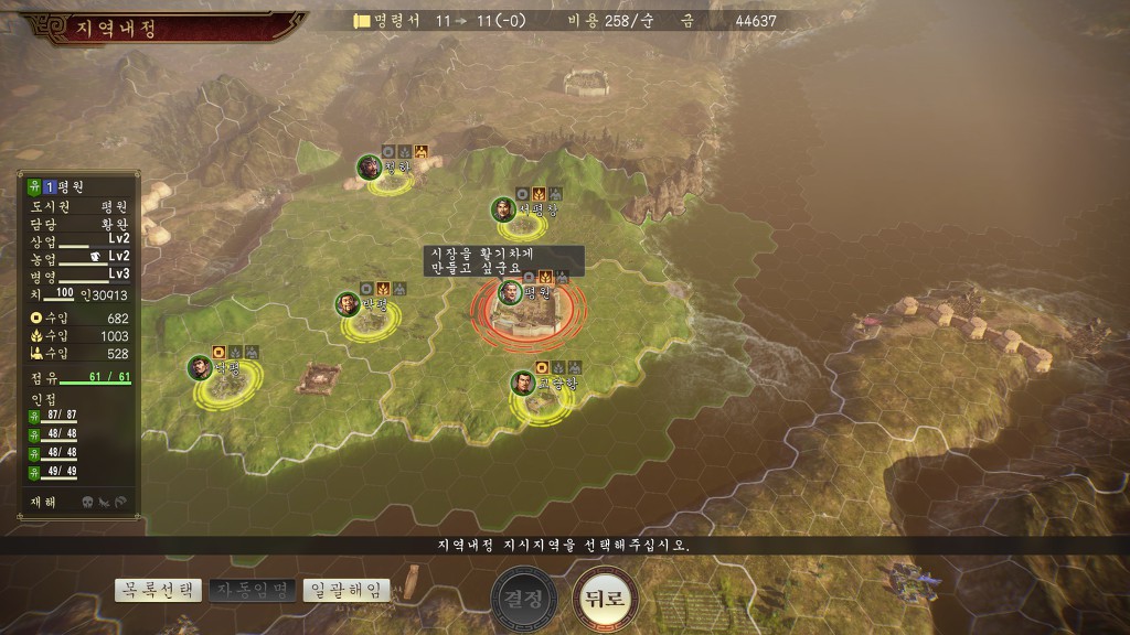 그리고 저곳을 내정을 다 돌리려면 평원만 해도 평원, 청하, 낙평, 박평, 고당항, 서평창 이렇게 6명의 장수가 담당관으로