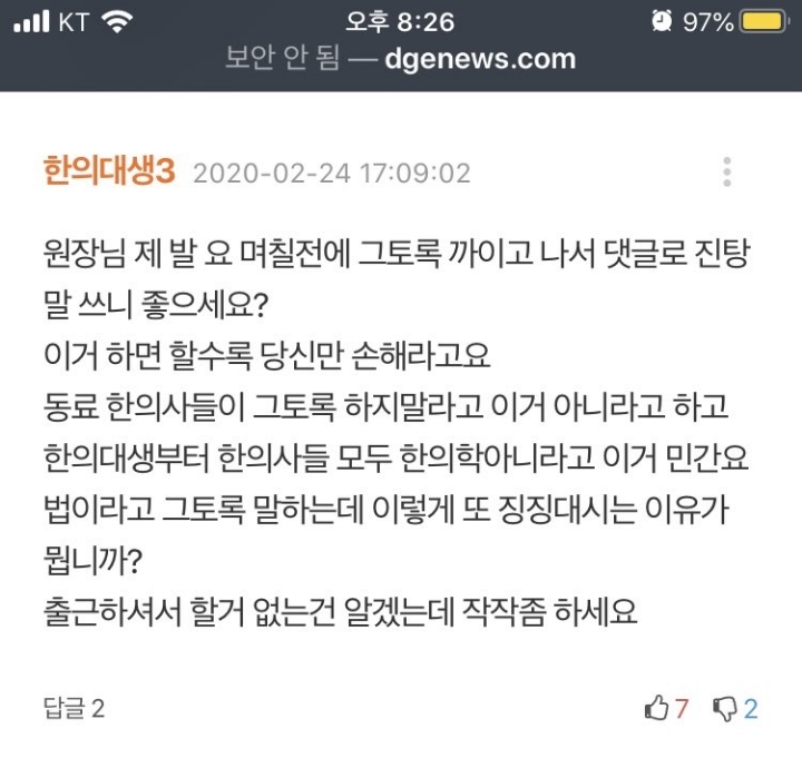 작성자2Pac 작성시간 20.02.25 ㅋㅋㅋㅋㅋㅋㅋㅋㅋㅋ 근데 한의대생들도 웃긴 게 자기들 하는 치료 전반에 걸쳐 성찰해 볼 필요가 있는데