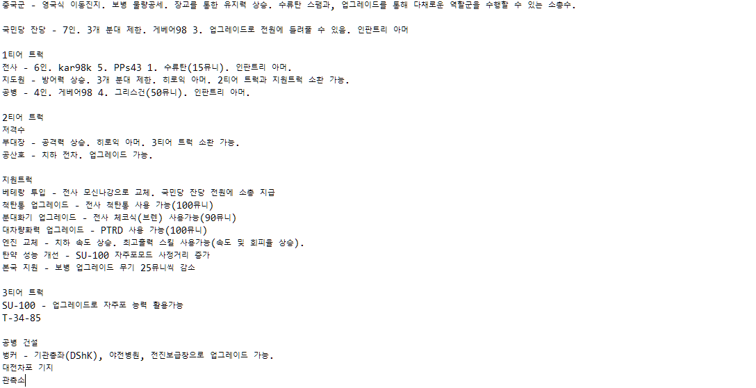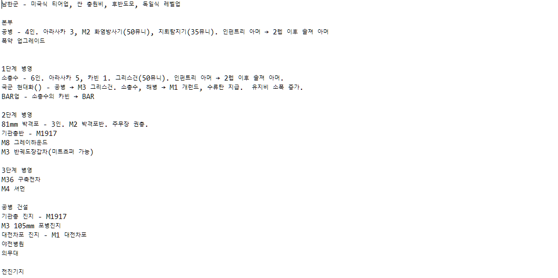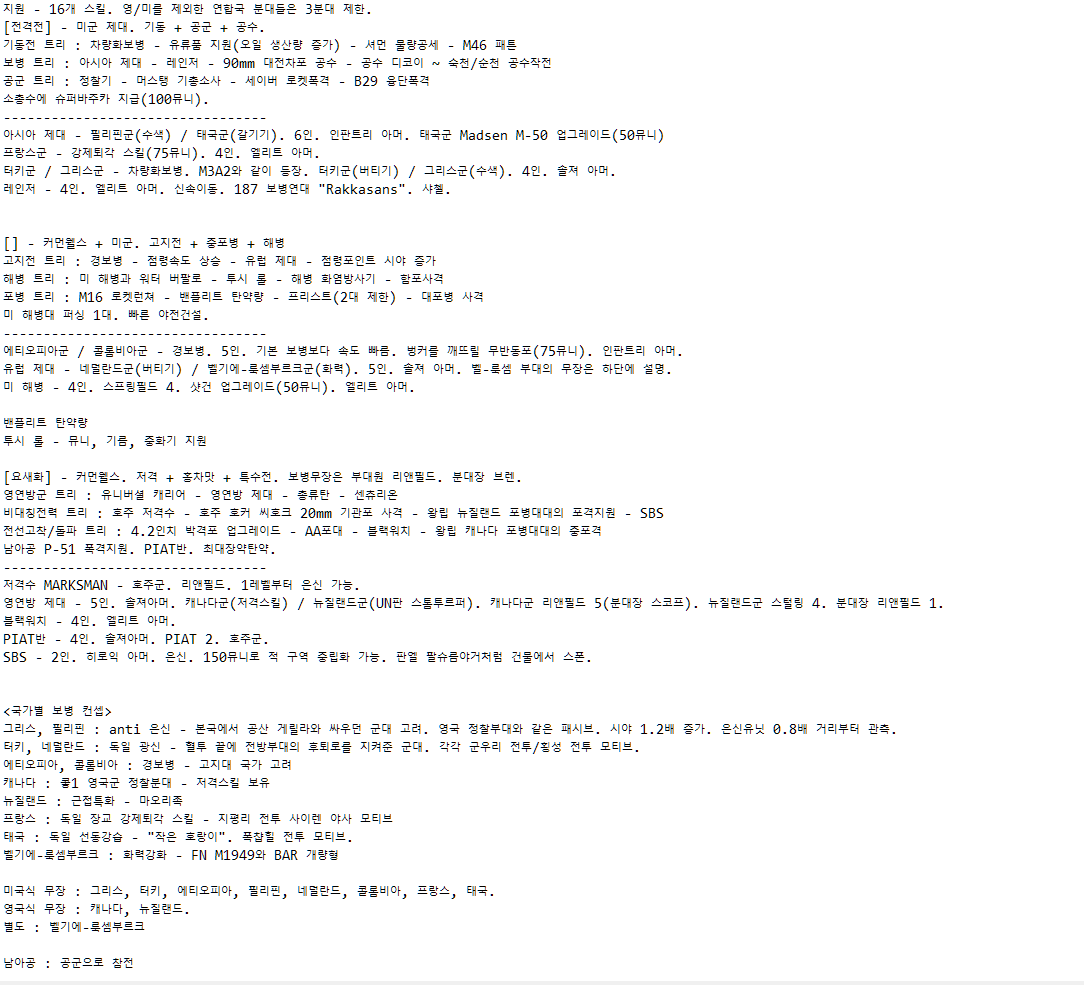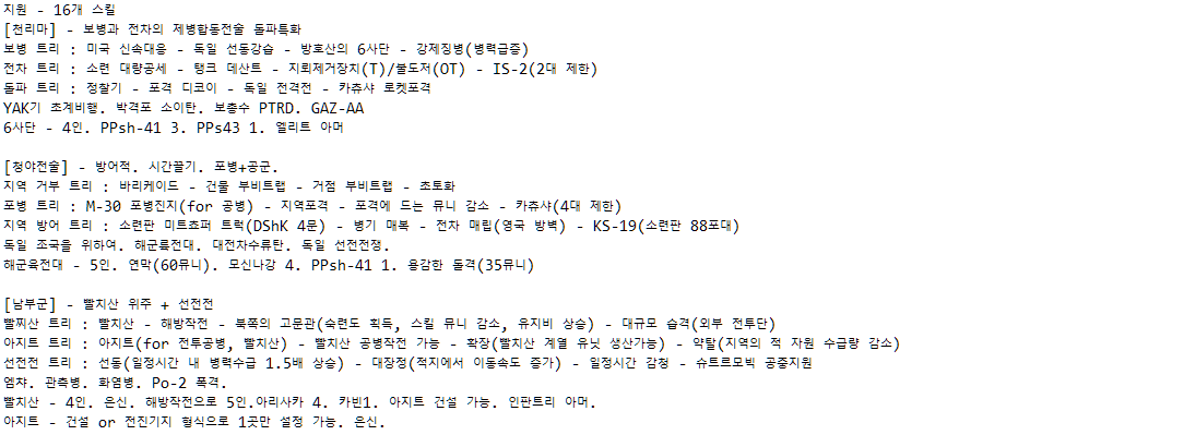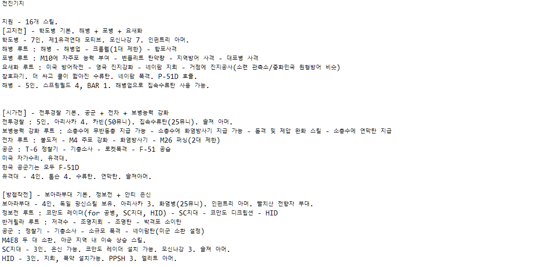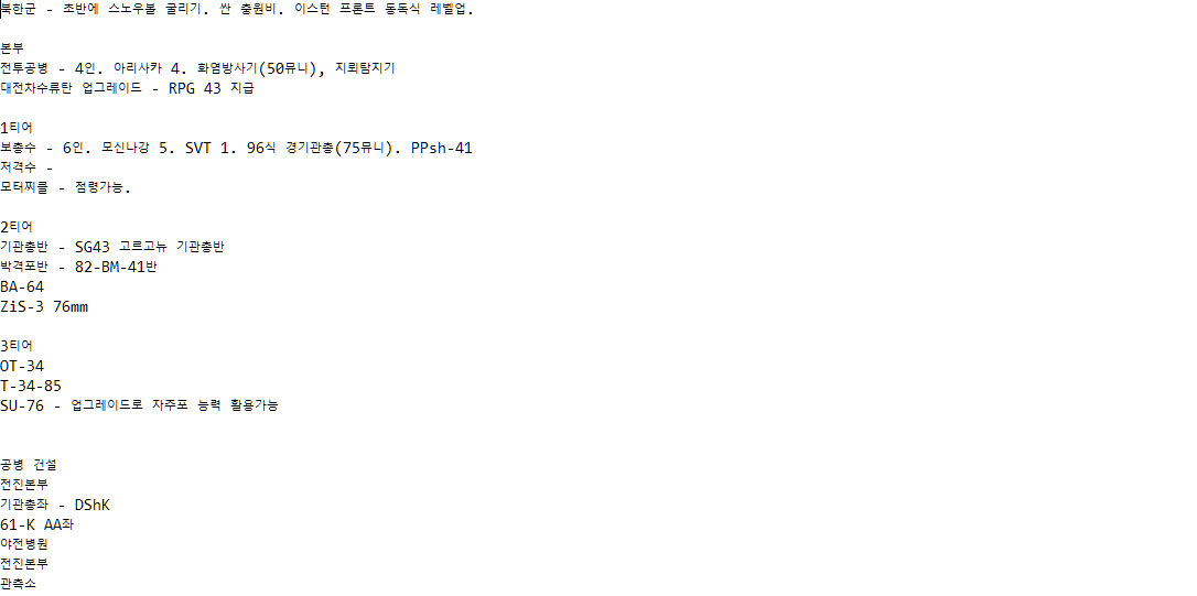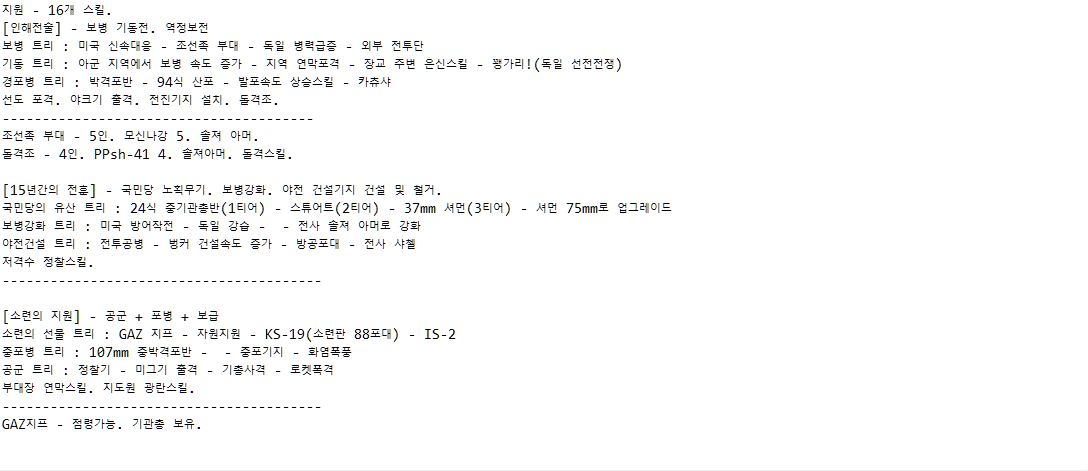 특히 도움을 받고 싶은 부분은 한국군의 "방첩작전" 트리, 북한군의 "청야전술" 트리, "남부군" 트리, 북한군 및 중공군의 셔먼 사용 여부(북한쪽은 엠차가 흘러들어갔다는 이야기는 들었는데, 딱히 실전사례를 찾지 못해서요), 전투기 호출 스킬 여부입니다. 또 제가 멀티는 뛰어본 적이 없어서, 밸런스적인 부분에서도 조언해주신다면 감사히 받겠습니다.