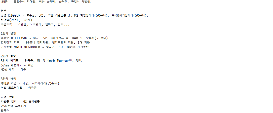 요즘 재미삼아 "한국전쟁을 CoH 시스템에 넣으면 어떻게 될까?"를 짜보고 있었습니다. 어느정도 완성이 되어보이긴 한데, 몇가지 빈자리와 고증이 맞는건가? 싶은 부분이 있어서 조언을 좀 구하고자 합니다. 넵, 솔직히 아이디어가 고갈되었습니다(...)