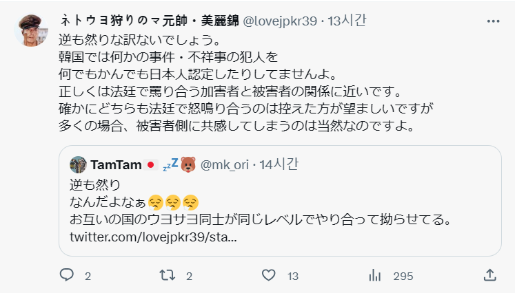 반대로 있을리가 없겠죠. 한국에서는 뭔가의 사건 및 불상사의 범인을 억지로 일본인 인증을 하거나 하지 않습니다. 제대로 얘기하면 법정에서 다투는 가해자와 피해자의 관계에 가깝습니다. 확실히 어느 쪽도 법정에서는 고성이 오가는 것은 피하고 싶겠습니다만, 많은 경우, 피해자 측에게 공감을 할려고 하는 것은 당연한 것 입니다.