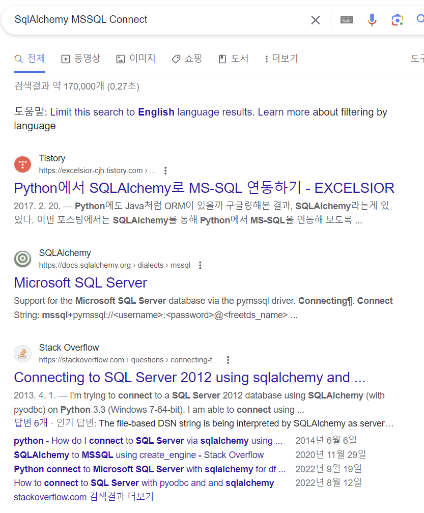구체적인 사례를 들어 봅시다. 여러분은 python으로 SQL SERVER DB에 접속하여 sportsdb라는 DB를 SELECT하고 INSERT / UPDATE하는 프로그램을 짜야 합니다. 이 경우 사용할 수 있는 라이브러리는 대체로 pmyssql 이나 SqlAlchemy 정도입니다. 자 그럼 구글에서 SqlAlchemy MSSQL Connect 로 검색을 해봅시다.