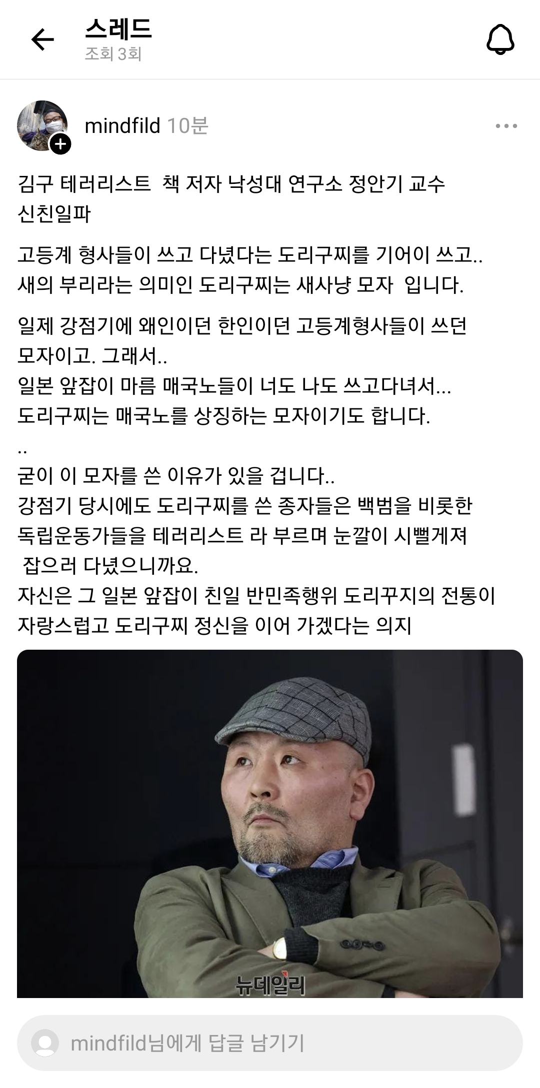 도리구찌 쓴 앞잽이 작성자클리퍼s|작성시간24.08.16|조회수364 목록 댓글 5 글자크기 작게가 글자크기 크게가 다음검색 현재 게시글 추가 기능 열기 북마크 신고 센터로 신고 댓글 댓글 5 댓글쓰기 답글쓰기 댓글 리스트 작성자오리엘 | 작성시간 24.08.16 관상이 딱 입니다 그려 작성자집중호우 | 작성시간 24.08.16 한 대 줘패고 싶은 관상이군 작성자다크킬러 | 작성시간 24.08.16 ㅋㅋㅋ 심지어 수염부터도 작성자花美男 | 작성시간 24.08.16 토착왜구는 다 죽어야 한다고 생각하는데 모자로 까는건 좀… 작성자bamdori | 작성시간 24.08.16 뇌절 씨게 하네. 나도 빵모자나 헌팅캡 류 좋아하는데. 순식간에 친일 유사쪽발이가 되어버렸어. 댓글 전체보기