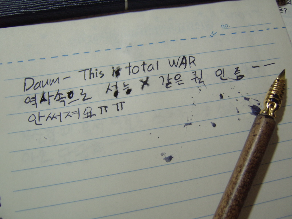 작성자한교 작성시간 10.01.29 생긴게 만화용 펜촉이랑 비슷하네요.. 펜 각도를 자기 손에 맞는 방향으로 기울여야 잘 써지던데 그래야 종이를 긁을때 종이가 일어나지 않는다던가 하거든요.. 그리고 습기많거나 비온날 비가오고있는 날에는 저러한 방식의 글쓰기를 하면 종이에 잉크가 번져서 안습해지더근용 어디까지나 만화용 펜의 이야기지만 비슷한 부분도 있을듯해요..