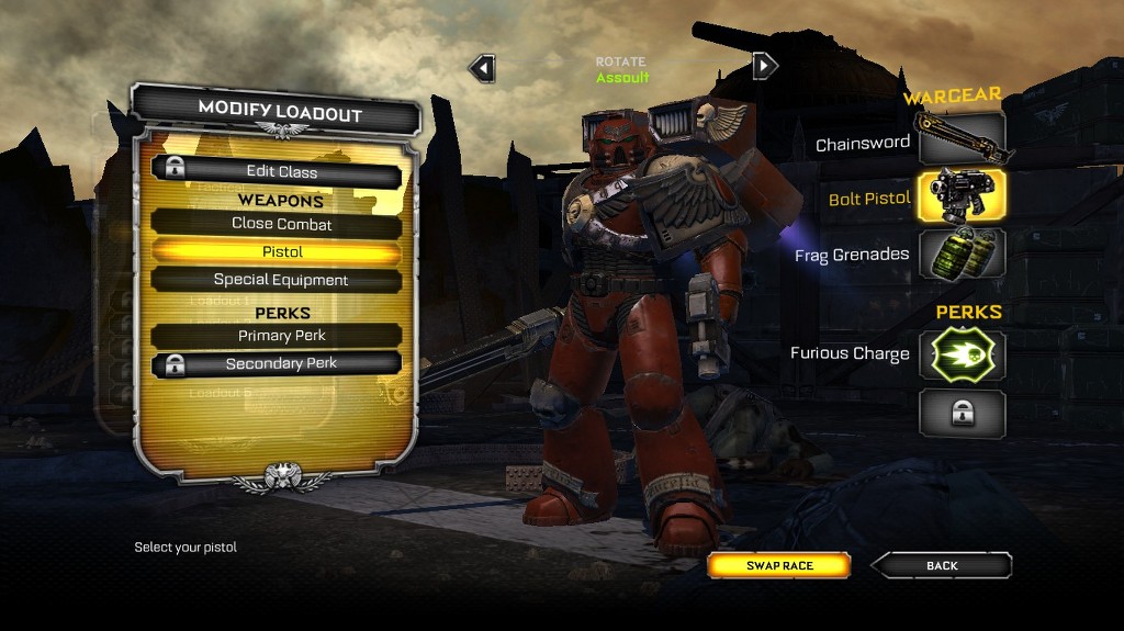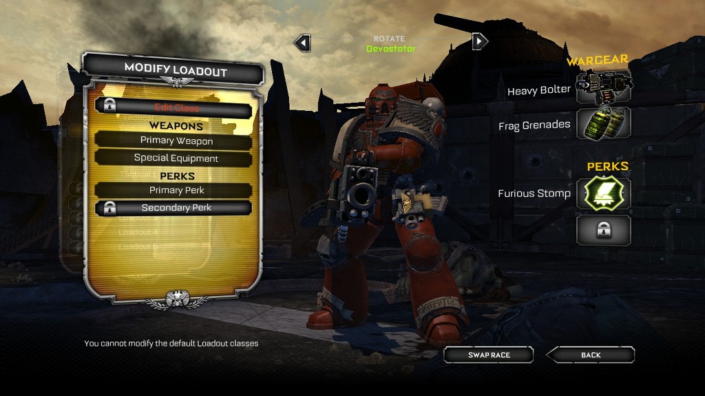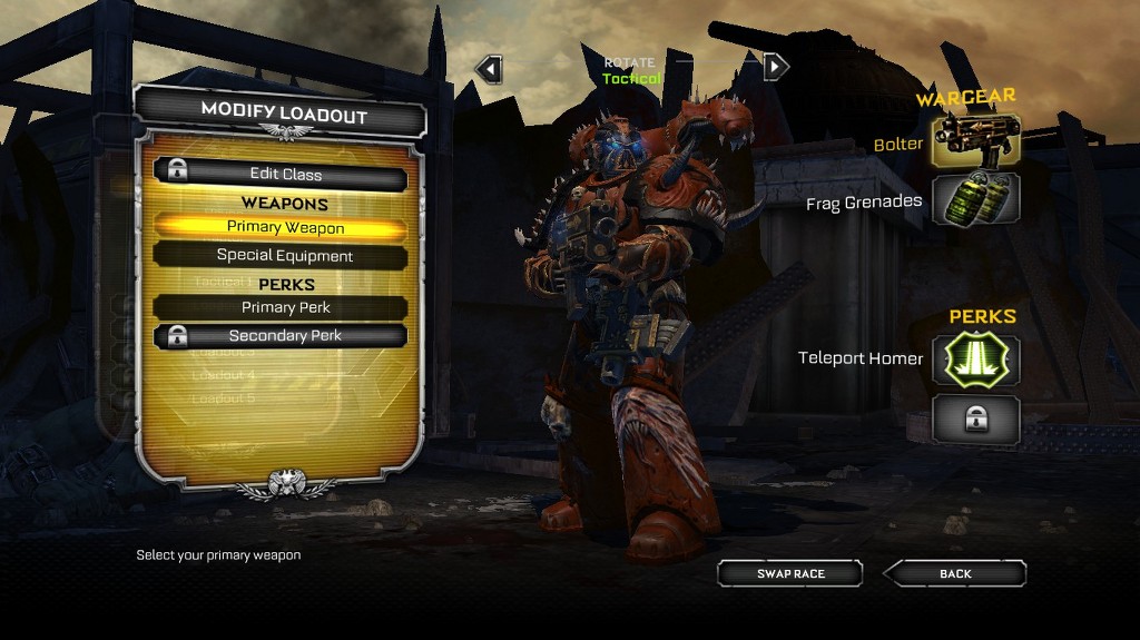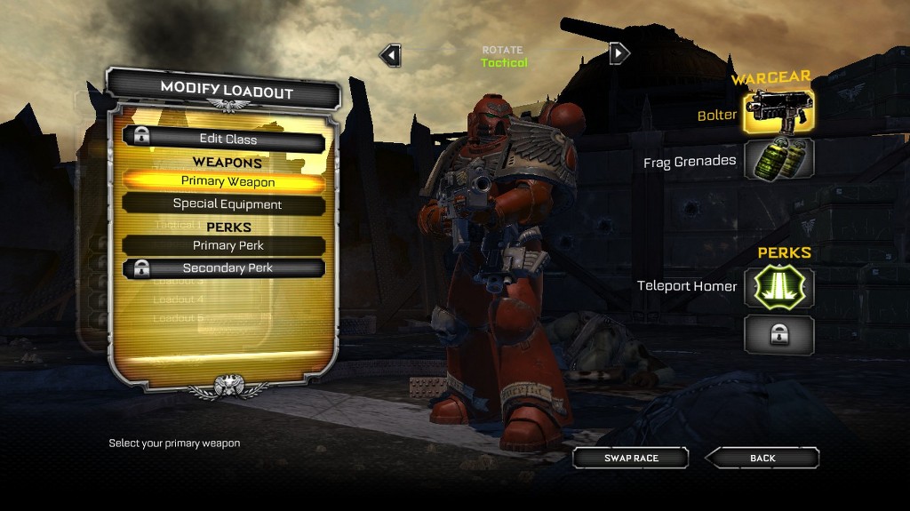 먼저 택티컬마린(편의상 이후엔 스페이스 마린쪽 병과이름만 붙이겠습니다..ㅜㅜ 이름만 다르지, 같은 병과니깐요.)입니다. 저격총 성격의 무기(스토커 볼터), 볼터, 샷건 성격의 무기(멜타건) 등등 개성이 뚜렷한 여러 무기를 고를 수 있고.. 가장 범용성이 큰 병과입니다. 퍼크를 통해서 여러 무기를 들고 다니거나, 아군이 자신의 위치에서 부활하도록 할 수 있습니다.