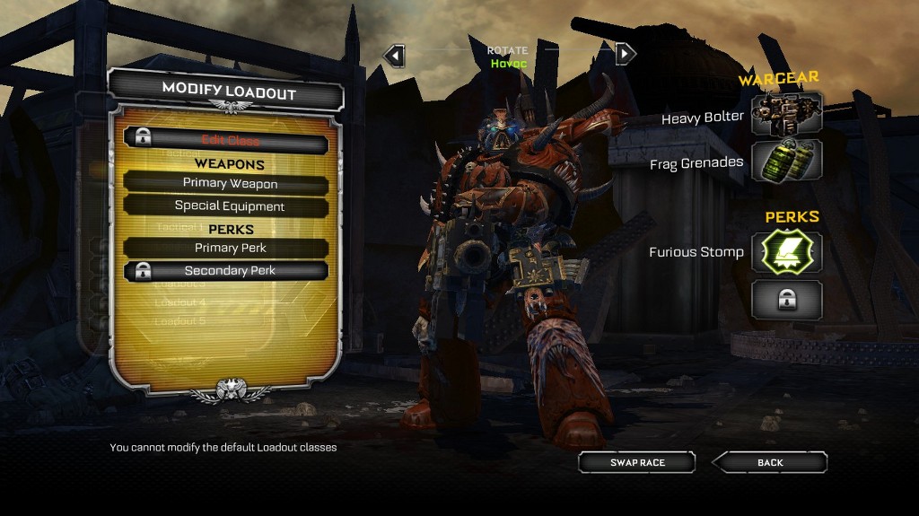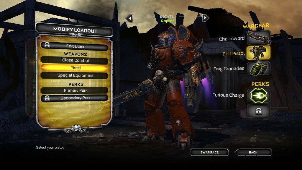 싱글캠페인과는 별개로 현재 두 종류의 멀티플레이도 지원하고 있습니다. 현재의 멀티플레이는 카오스 스페이스 마린과, 스페이스 마린이 싸우는 방식이구요.. 지역점령을 통해서 1000점에 먼저 달성하는 진영이 승리하는 모드와, 일정 킬 수가 되면 승리하는 모드가 있습니다. 플레이어는 택티컬마린/카오스마린, 데바스테이터마린/하복, 어썰트마린/랩터 세가지 병과 중 하나를 선택할 수 있습니다.