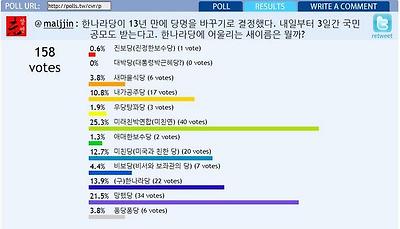 말찐이 ’트위터 폴’을 이용해 트위터 이용자를 상대로 한나라당 당명을 조사했더니, 미래친박연합(미친연)이 25.3%로 1위를 차지한 가운데 ‘망했당’(21.5%), ‘(구)한나라당’(13.9%), ‘미친당(미국과 친한 당)’(12.7%), ‘내가공주당’(10.8%) 등이 뒤를 이었다.