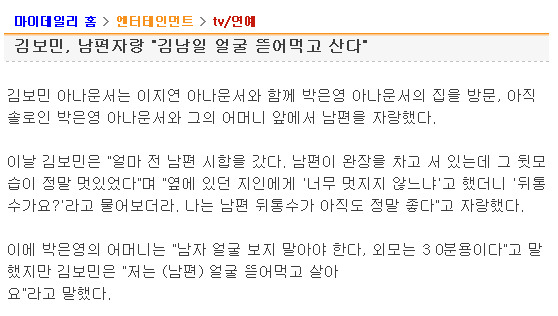 | 안방 TV가 빛나는 밤에 (연이말2)에서 작성된 글입니다. 이 곳은 무조건적으로 연예인을 비난하는 곳이 아닌 올바른 비판을 지향하는 카페입니다. |