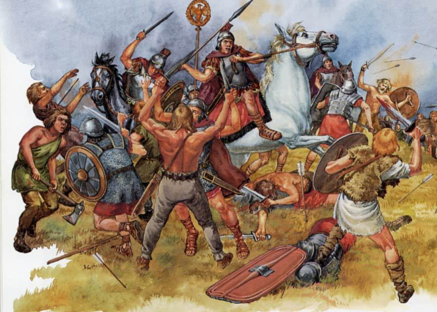 (→ 색인 : 로마사)율리우스 카이사르 시대에 게르만족은 라인 강 서쪽에 완전히 자리를 잡았고, 남쪽으로는 도나우 강까지 이르렀다. 게르만족이 로마인과 처음으로 크게 충돌한 것은 킴브리족과 테우토니족(튜튼족)이 갈리아 남부와 이탈리아 북부를 침략한 BC 2세기였는데 이들은 BC 102~101년에 로마의 마리우스에 의해 섬멸되었다.