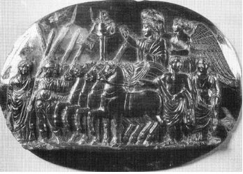 서머빌 보석에 있는, 4세기 로마 시절에 기독교인 황제의 개선식을 묘사한 광경. 제국과 기독교적 표식 모두가 쓰이고 있음에 주목하라.(출처: 필라델피아에 있는, 펜실베니아 대학 미술관)