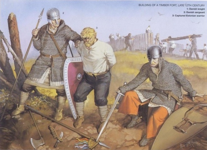 - 12세기 후반 발트해 지역에서 목조 요새를 건설 중인 덴마크군의 모습. 1번은 덴마크 기사, 2번은 덴마크 하사관, 3번은 포로로 잡힌 에스토니아인 전사. -