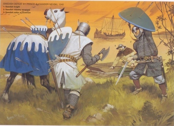 - 네바강 전투에서 패배하고 도망치는 스웨덴군의 모습. 1번은 스웨덴 기사. 2번은 스웨덴 보병 하사관. 3번은 스웨덴인 선원 혹은 뱃사공.-