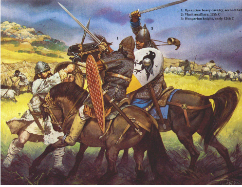 긴 소매의 메일 호버크는 중동에서 유래한 듯 보이지만, 비잔티움의 근접전 기병은 12세기엔 약간 경장화되어 있었다.