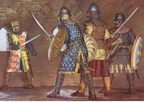 방패는 이탈리아와 십자군 국가에서 보이는 것과 비슷하지만, 별개의 메일 벙어리장갑은 이탈리아에서 받아들인 것이긴 해도, 날 굽은 사브르는 확실히 투르크형이다.