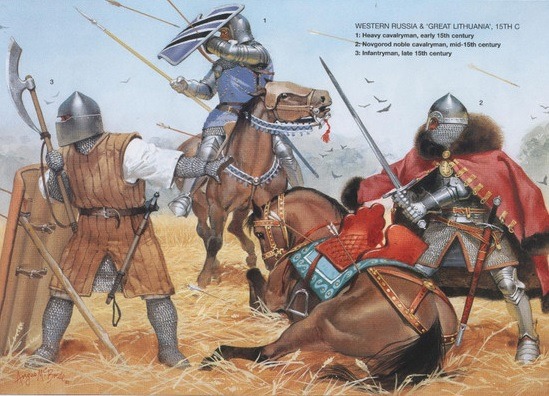 - 오스프리 삽화 중에 있는 '서부 러시아와 위대한 리투아니아'. 1번은 15세기 초의 중기병. 2번은 15세기 중엽의 노브고로드 귀족 기병. 3번은 15세기 후반의 보병이다. -