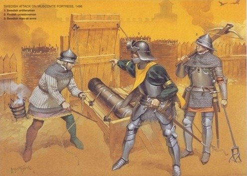 - 모스크바 공국의 요새를 공격하는 스웨덴군. 1번은 스웨덴 포병. 2번은 핀란드인 석궁병. 3번은 스웨덴 군인 -