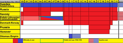 - 대북방전쟁 당시 참가국들이 누구 편에 서서 싸웠는가를 보여주는 도표. 폴타바 전투의 패배 소식을 들은 덴마크와 작센, 폴란드가 확실하게 러시아 편에 서버렸다는 것을 볼 수 있다. -