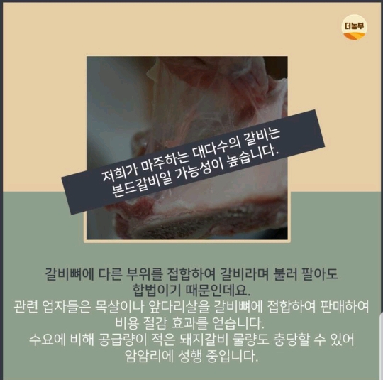 당장마트가서. 목살이랑 갈비가격 비교해보면 가격차이가 근2배이상 목살이비싸죠 앞다리조차도 같거나 비슷하고요. 거기다 보통갈비는 앞다리쪽에서 띄어서 애초애 갈비에 붙어잇는개 앞다리살이져 소갈비살 에나오는 갈비살 같은 뷰위는 삽겹살이랑 등갈비로 먹거든요 -