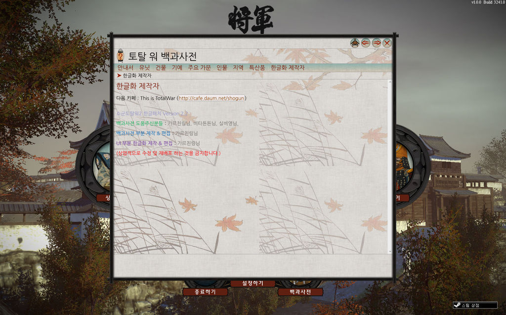 -백과사전 미포함- 암호 shogun2k1020 ②다운로드↓ -------- ※ 셋업방식을 획기적으로 변화하였으며 언인스톨버그또한 잡혔으며 용량또한 80%이상 줄였습니다. *1시간 게임후에는 30분간 휴식을 취하는 것이 좋습니다.* *설치전 백과사전을 백업해두시면 언인스톨시 재설치없이 영문으로 즐기실 수 있습니다.* □설치후에 한글패치가 제대로 적용이 안될경우에는 셋업파일의 용량을 확인해주시길 바람니다.□ 정상파일의 용량 : 4.34MB (4,555,859 바이트) 한글패치 제작할때는가만히 있던분들이 배포되니 욕설과 비하 발언이 난무하는군요. 또한 배포되기전에 한글패치 오역잡아주신다는 그많은 유저분들또한 다사리지고 2분만이 남으셨지요. 앞으로 향후 공개적인 업데이트는 없을 예정입니다. -악플은 보이지않는 양날의 칼이다. 아무리 베어도 끝이 없고 베는 사람마저도 보이지않는 양날의 칼날에 베이는 줄모르고 계속 베기 때문이다.- 가르친링 ESC |
