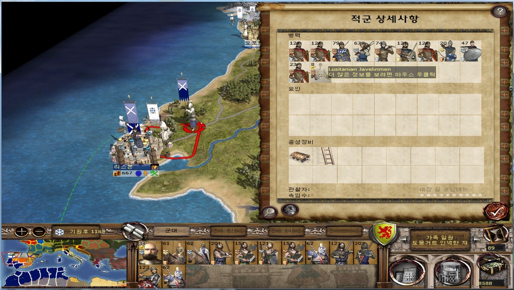 자랑하지만 짧은 사정거리의 Lusitanian javelinmen 이 반수를 차지하고 있습니다. 게다가 전체적으로 얇은 갑옷을 입고 있어서, 기동력과 물량 중심으로 싸우는 스코틀랜드 왕국의 입장에서는 쉬운 상대에 속합니다.