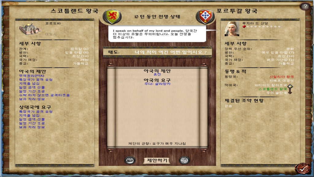그때 이베리아 반도 남쪽으로부터 아라곤 왕국이 코르도바를 노리는 정황이 포착되었습니다. 포르투갈 왕국과 싸우는 틈을 노려 뒤통수를 치려는 속셈으로 보입니다. 하지만 스코틀랜드