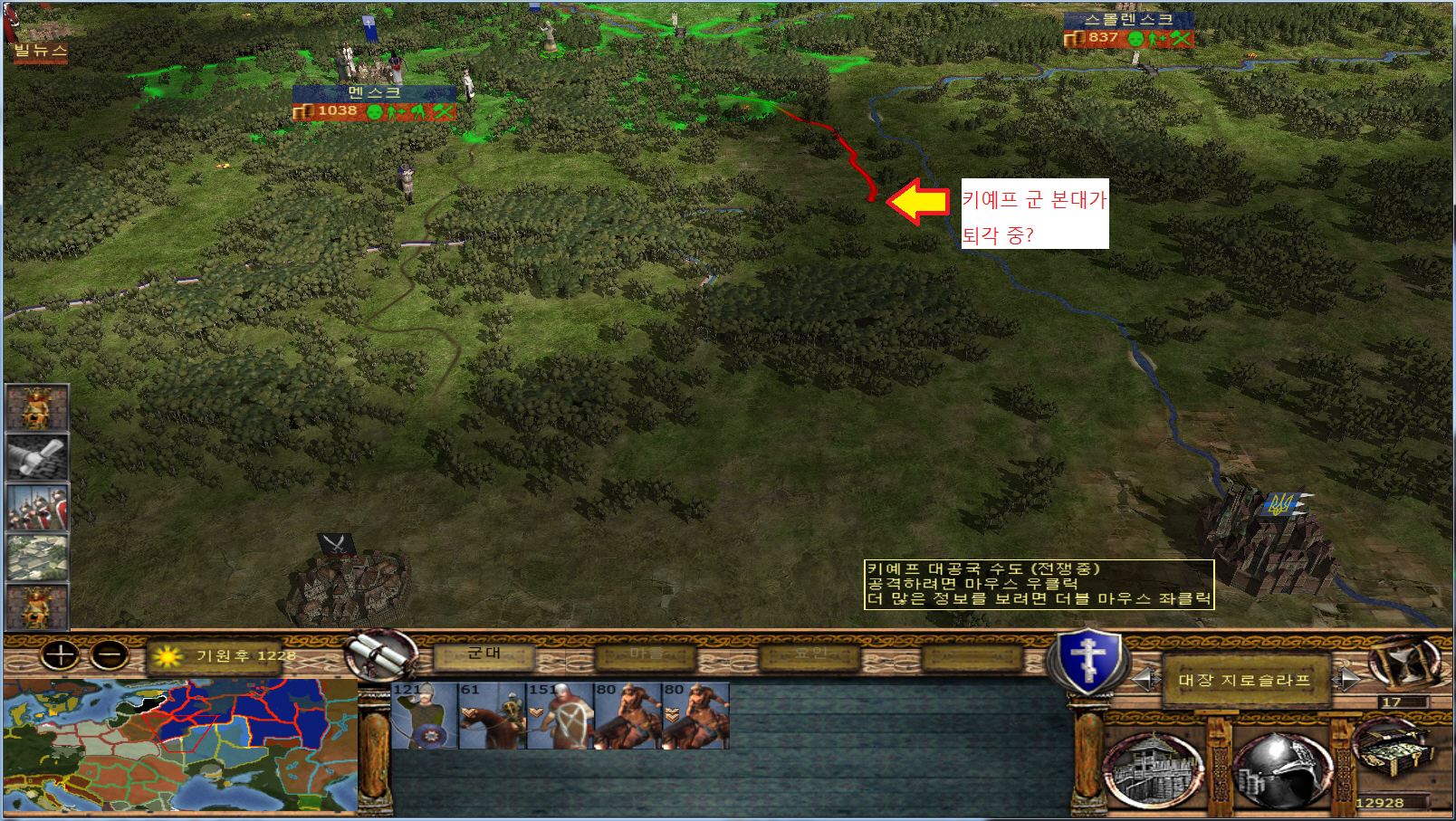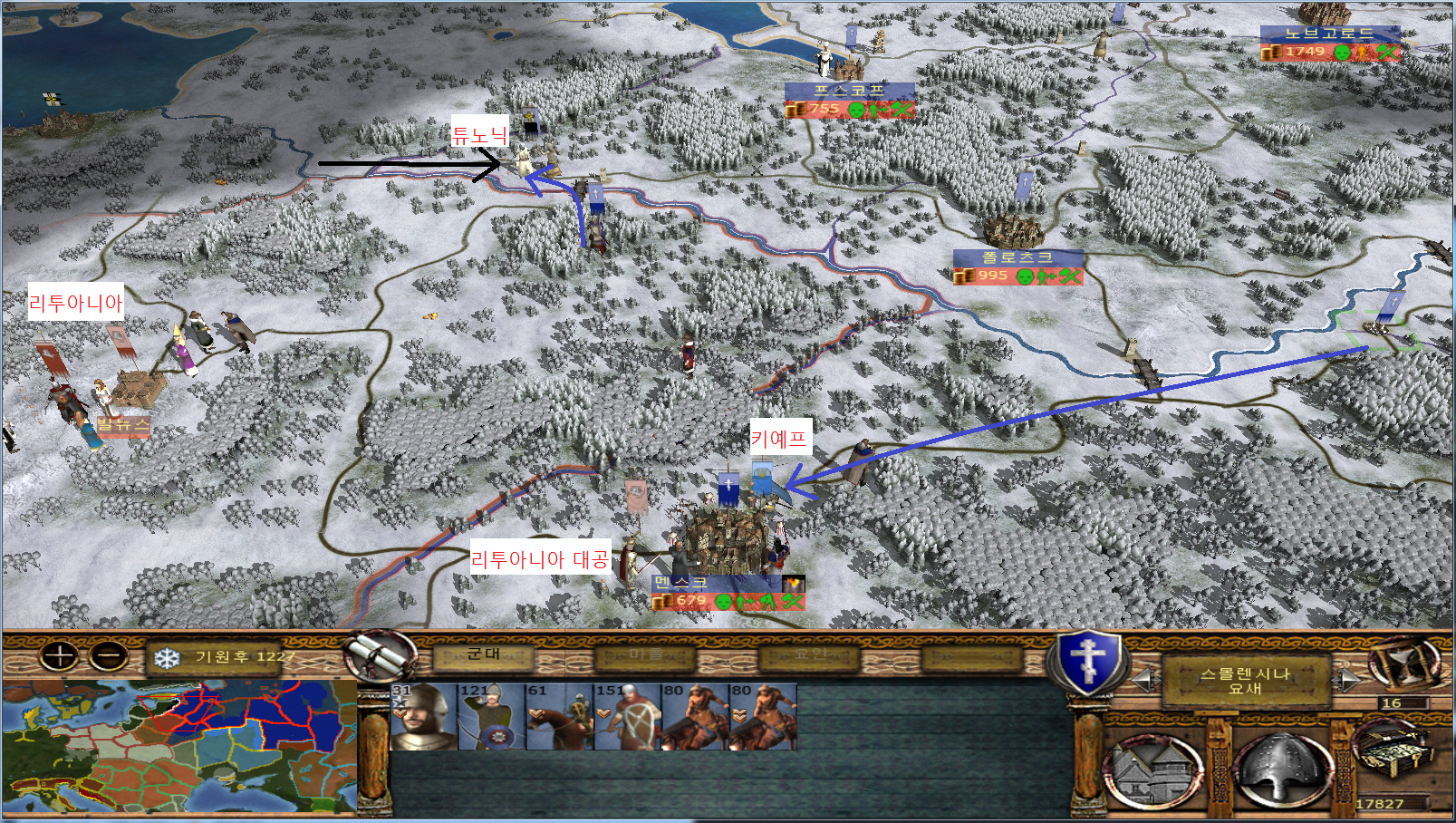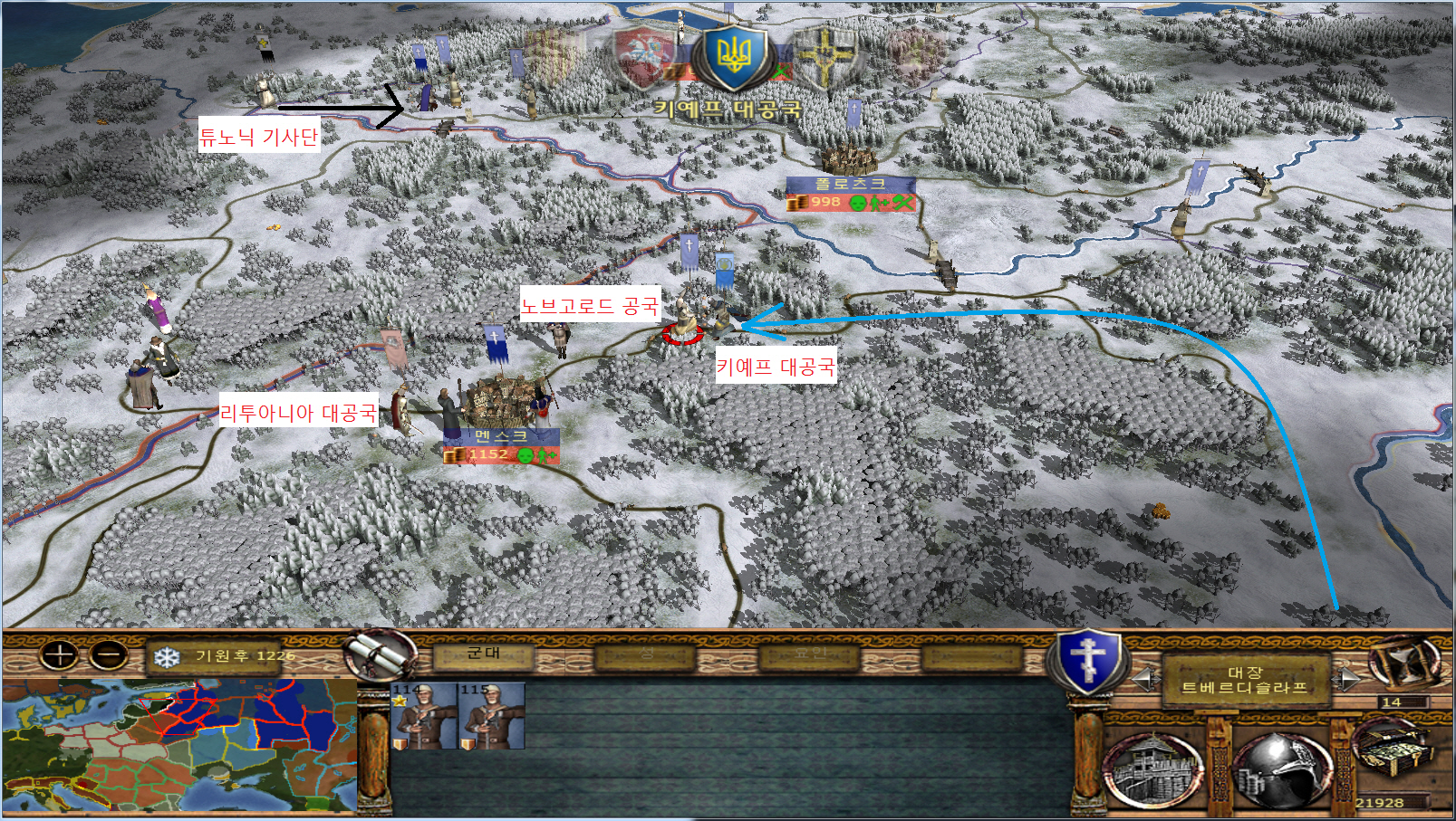 이런 상황에서 우리 노브고로드 공국은 3면 전선에서 허우적대고 있습니다. 특히 이번에 새로 등장한 키예프 군은 만만히 볼 수 없는 놈들입니다.