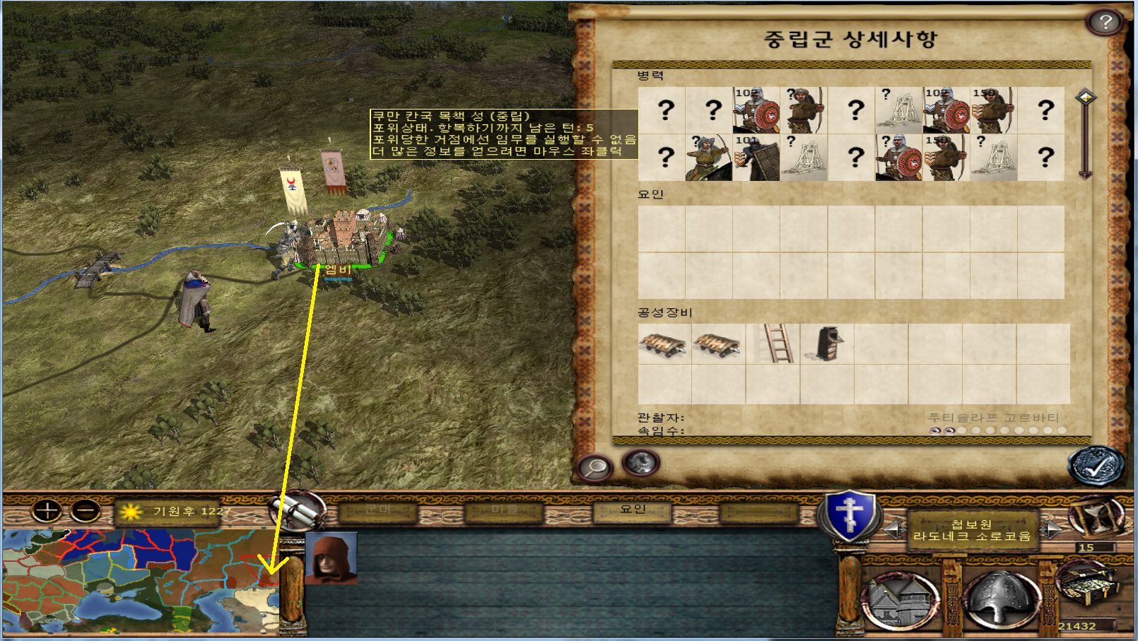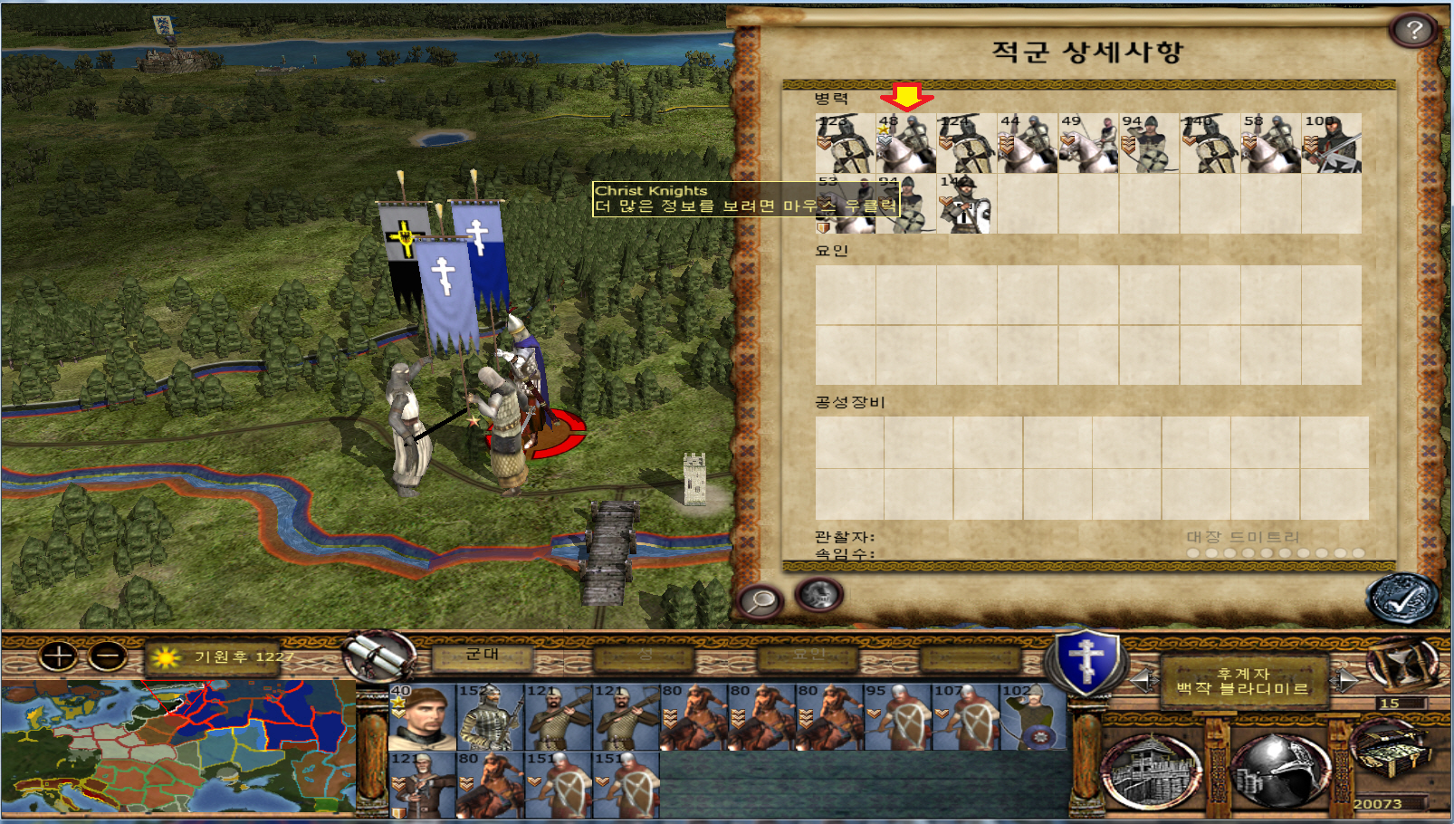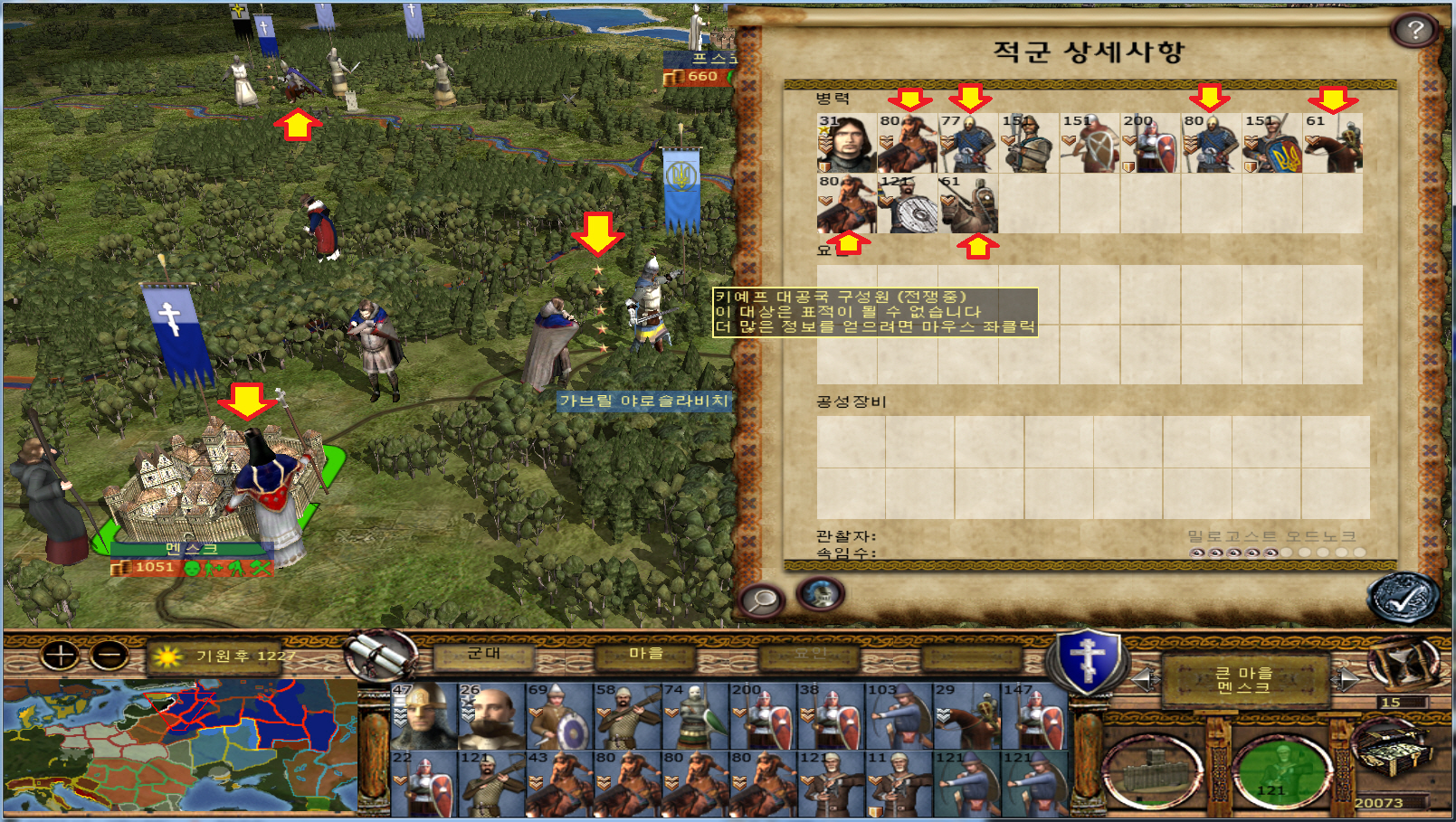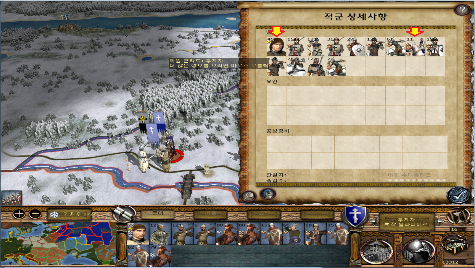 5성의 유능한 장군이 지휘하는 것은 기본. 용병까지 고용해서 기병 전력이 굉장히 충실합니다. 잡졸이 많은 우리 노브고로드 군을 야전에서 격파하려는 의도가 엿보이네요.