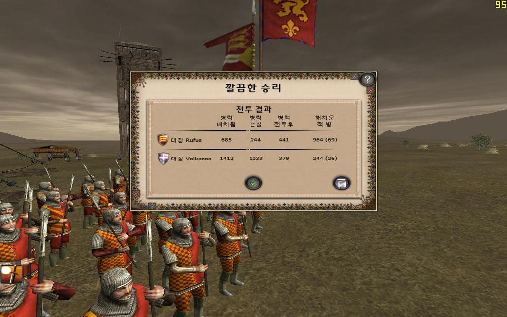 이겼다고 좋아했는데 바로 다시 쳐들어 오더군요; 턴 종료하고 포위중인 군이 첫타 날리고 턴 진행중 비잔틴 차례에 다시 쳐들어 온거 같더군요. 이번이 더 위험했습니다.; 병력 재충원도 안돼있고 성벽은 다 부셔져 있고; 비잔틴은 라티콘보병대 비잔틴근위궁병까지 있더군요. 휴 그리고 공성병기로 중앙 망루도 뿌시고;; 독한놈들. 이번도 위와 같은 전술이었는데요 양사이드 장궁병의 활양으로 이겼습니다.; 화살 조절한다고 고생했습니다. 공성포격할때 활 안쓰고 아껴서 이길수 있었던거 같네요. 휴~.
