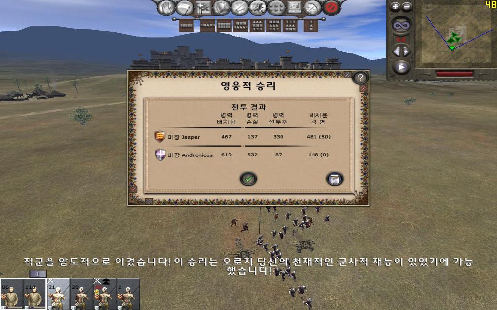 병력 없는데 기습적으로 성벽 다 뿌시고 들어오네요. 쳐들어와서 막는다고 고생좀 했습니다. 이 전술의 핵심은 장국병을 성벽 사이드에 넣어서 무너진 성벽으로 들어오는 병력 집중 사격해서 사기저하로 후퇴 시키는 겁니다. 중앙으로 안 밀고 와서 이길수 있었습니다. 사실 반쯤은 포기하고 했는데 다행이 이겼네요. 적군에 아마 적군에 장군이 있었으면 졌을 겁니다. -ㅁ-aa