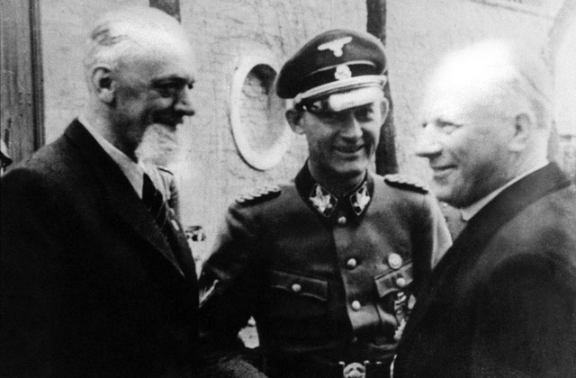 파벨리치와 악수하는 스테피나츠 대주교. 많은 세르비아인 학살과 관련이 있음에도 불구하고 훗날 그는 로마 교황청에 의해 성인으로 추앙되었다.