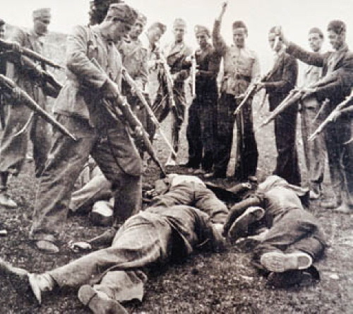 테러를 가하는 크로아티아 우스타샤 당원(左)과 학살되는 세르비아인