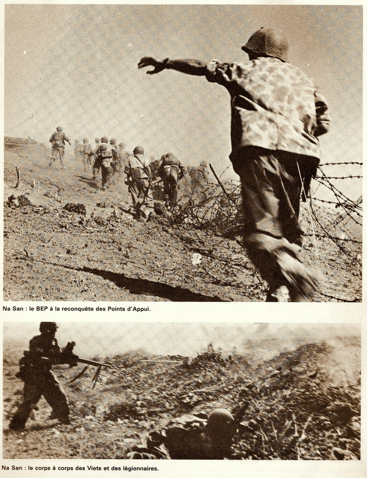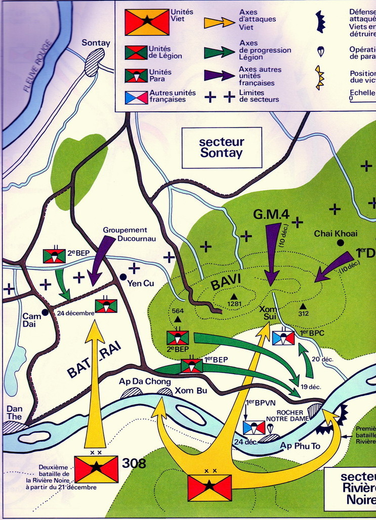 나산 전투 지도. 노랑과 빨강에 별이 그려진 것은 베트민군이고 진격방향은 노란색 화살선이다. 프랑스군의 경우는 녹색은 외인부대, 파란색은 그외 프랑스 정규군의 진격을 그린 것이고, 녹색과 빨간색으로 그려진 네모는 1BEP(외인 제1공수대대)와 2BEP(제2공수대대)이다. 결국 이들이 베트민군 진격로 상에서 이들을 저지하는 프랑스군의 선봉인 셈이다.