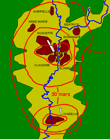 프랑스군은 이 기지에 사주경계가 가능한 49개 거점을 구축하고 이 몇 개의 거점을 하나로 묶어 방어진지를 형성하도록 하였다. 적의 주요 접근로를 통제할 수 있는 지역일대에 강력한 외곽진지를 편성하였고 주 방어지대인 내곽진지에는 전 병력의 2/3를 배치하여 진지를 고수할 수 있도록 하였다. 각 방어진지 명칭은 이사벨(Isabelle), 베아트리스(Beatrice) 등 아름다운 여자 이름을 붙였고 내곽진지 내에는 지휘소, 포병진지, 보급기지, 비행장이 위치하였다. 비행장을 방어하기 위해서는 별도로 몇 개의 거점을 구축하여 놓았다. 이와 같이 디엔 비엔 푸는 프랑스군의 관점에서는 베트민군의 능력을 고려할 때 난공불락의 요새였다.