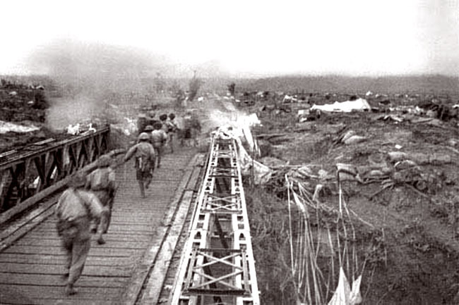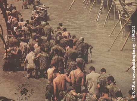 베트민군이 디엔 비엔 푸 요새 내부로 들어가는 임시가교를 건너고 있다. 최후의 날의 모습이다.