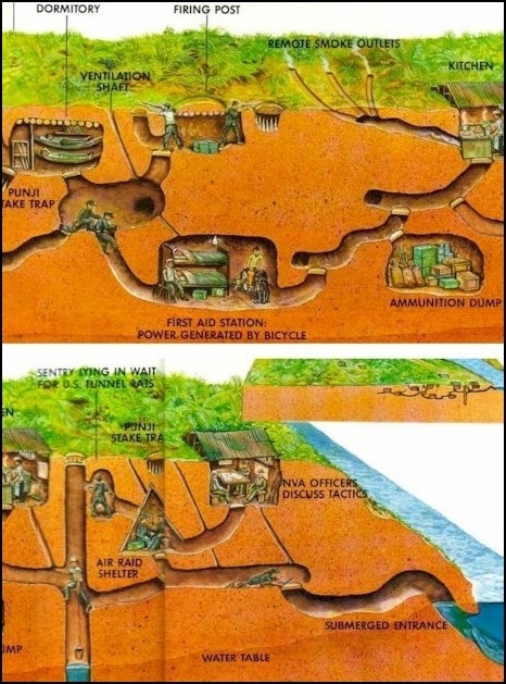 병력 및 물자의 은닉은 천연동굴이나 치밀하고 견고하게 구축된 지하 동굴을 이용하였다. 이 기술은 역사적으로 오랜 항쟁기간에 걸쳐 계속적으로 보완되고 발전되어 왔다. 사이공 20마일 북방 ‘철의 삼각지대’라고 명명한 빈 두옹(Binh Duong) 지역에서는 1964년부터 1967년까지 3차에 걸쳐 작전을 하였으나 엄청난 지하 동굴을 다 찾지 못하고 발견된 것은 폭파하였으나 작전부대가 철수한 후에는 다시 보수하여 사용하였다.
