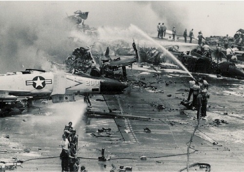 Forrestal 에서 발생한 사고를 간신히 진압하고 난 직후의 아수라장