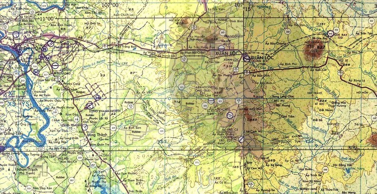 쑤안록의 전략적 위치를 보여주는 지도... 주요 도로의 길목에 자리잡은 평야 지대의 다소 고도가 높은 구릉지다. 이곳만 돌파하면 핵심요충지 비엔호아 공군 기지로 가는 직통로가 뚫린다.