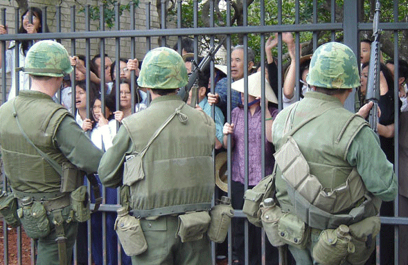 대사관으로 몰려든 피난민들을 제지하는 미 해병대