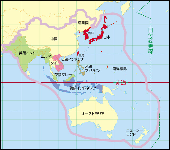 제국주의 일본이 주장한 소위 "대동아공영권"의 영역. 말로는 "자유로운 정치적 독립"과 "권리"운운했으나 진짜 목적은 침략을 통한 영토 확장에 있었습니다. 일본은 점령지에서 철저한 약탈과 착취, 인권침해를 자행하였죠.