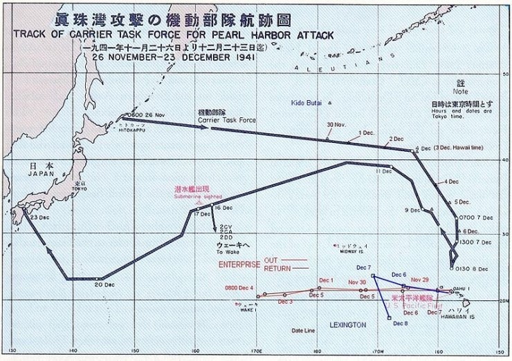 진주만 기습당시 나구모 함대의 이동경로. 최종적으로 개전 결정이 내려진 12월 1일, 그들은 이미 목표지점까지 절반이상을 이동하고 있었습니다. 즉, 일본은 처음부터 전쟁을 준비하고 있었고 외교는 부차적인 것에 불과했던 것이죠.