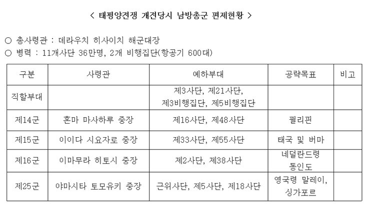 말로는 외교적 타결에 최선을 다한다고 했음에도 일본이 미국에 제시한 안은 결국 기존의 주장의 반복일 뿐이었습니다. 더욱이 협상의 진행과 관계없이 일본의 전쟁준비는 착착 진행되고 있었습니다. 11월 5일 나구모 주이치 중장이 지휘하는 25척의 함대는 비밀리에 훗카이도 동쪽 쿠릴열도에 있는 이투르프섬의 히토캇푸만으로 이동하여 진주만의 미태평양함대에 대한 공격 명령을 기다리고 있었고, 다음날에는 데라우찌원수를 사령관으로 "남방총군"을 편성했는데 전체 육군의 51개 사단중 4개군 11개 사단(제14군, 제15군, 제16군, 제25군) 36만명과 육군 항공대의 1/3을 동원하였습니다. 제14군은 필리핀을, 제15군은 태국과 버마, 제16군은 프랑스령 인도차이나, 제25군은 말레이시아를 각각 담당합니다.