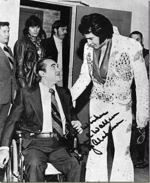 병원에서 퇴원하는 조지 월러스를 엘비스 프레슬리가 위로하고 있다.