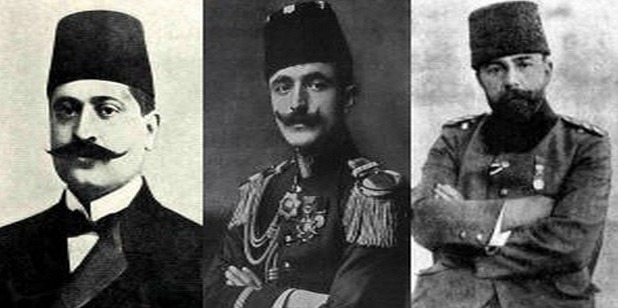 통일진보 위원회의 3지도자. 왼쪽부터 메흐메트 탈라트 파샤(내무장관, 수상), 이스마일 엔베르 파샤(전쟁장관), 아흐메드 제말 파샤(해군장관, 시리아 총독)