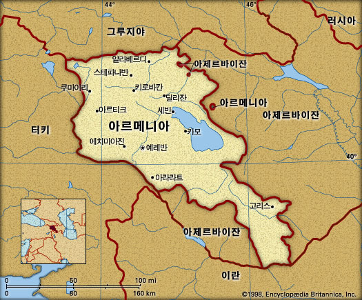 아르메니아의 위치. 이슬람 국가들에 둘러싸인 기독교 국가이다.