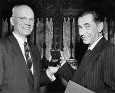 1961년 미국 물리학회에서 테이트 메달(Tate Medal)을 수여받는 파울 로스바우트(右). 1930년대 독일을 대표하는 물리학자였는 그는 1차대전 때 병사로 참전했다가 영국에 포로가 되었으며 이때부터 영국을 동경하기 시작했다. 유태인 아내를 둔 그는 히틀러가 정권을 잡자 영국을 위해 기꺼이 스파이가 되었으며 그리핀이라는 코드명으로 활동했다. 그는 독일이 원자폭탄 개발에 착수했음을 영국에 알렸고 그 진행과정을 상세히 보고하여 독일이 원자폭탄을 개발하는 과정이 잘못되고 있음을 알려주었다. 영국 대외정보부 MI6는 지금도 그와 관련된 자료를 보관하고 있으며 공개를 거부하고 있다.