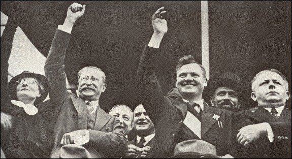 프랑스 인민전선 연합 내각의 레옹 블룸 총리(왼쪽에서 두 번째)와 프랑스 공산당 서기장 모리스 토레즈(앞줄 오른쪽에서 두 번째). 스페인 공화 정부로부터 지원 요청을 받은 블룸 총리는 스페인의 분쟁이 더 넓게 확산되는 것을 우려한 영국의 경고에 따라 불간섭 정책을 택했다. 스페인 공화 정부는 서구 민주 국가들로부터 어떤 도움도 받을 수 없었다.